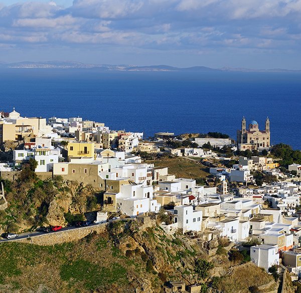 Syros ist die Hauptinsel der Kykladen. Sie ist zwei bis vier Schiffsstunden oder 25 Flugminuten von Athen entfernt. Um Syros herum reiht sich der Kranz der Nachbarinseln Andros, Tinos, Mykonos, Delos, Naxos, Paros, Sifnos, Serifos, Kithnos und Kea. Syros teilt sich in einen städtisch dominierten Süden mit intensivem Landbau und einen weitgehend unbesiedelten Norden mit etwas Weinbau, hügeligen Macchiaweiden (Thymian, Salbei) und weitläufigen, uralten Saumpfaden. Zerklüftete Küsten mit zahllosen Buchten verteilen viele kleine Strände um die Insel.